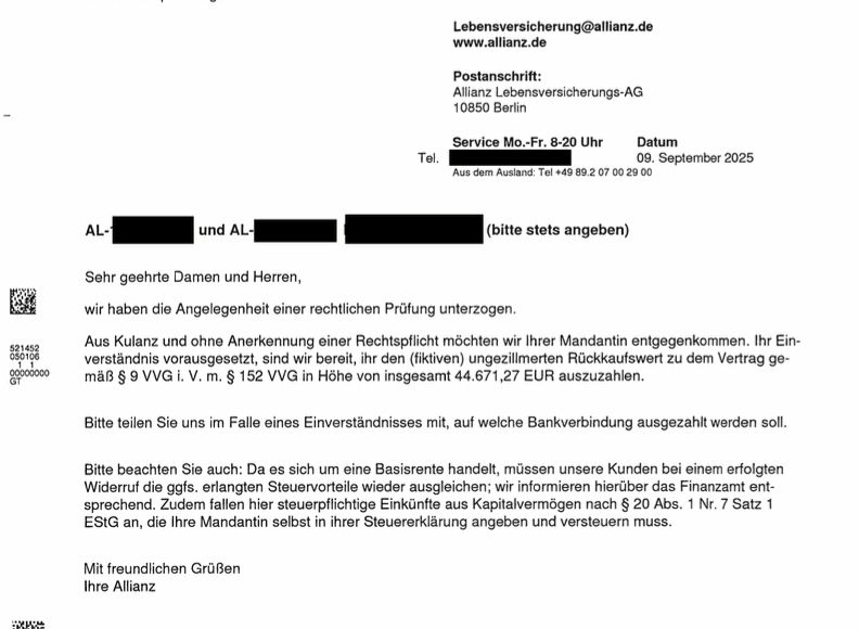 Mandant kann sich über einen Auszahlungsbetrag von 25.569,51 € freuen! Wieder einmal hat die Fachanwaltskanzlei Seehofer für einen Mandanten die Rückabwicklung eines Basisrentenvertrages bei der Allianz Lebensversicherung erreicht. Es handelte sich um einen Basisrentenvertrag der Allianz mit der Bezeichnung „Allianz BasisRente Invest“, der im Januar 2009 abgeschlossen worden war. Unser Mandant hatte den Vertrag bereits […]