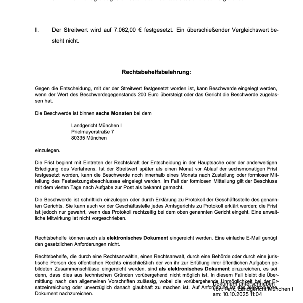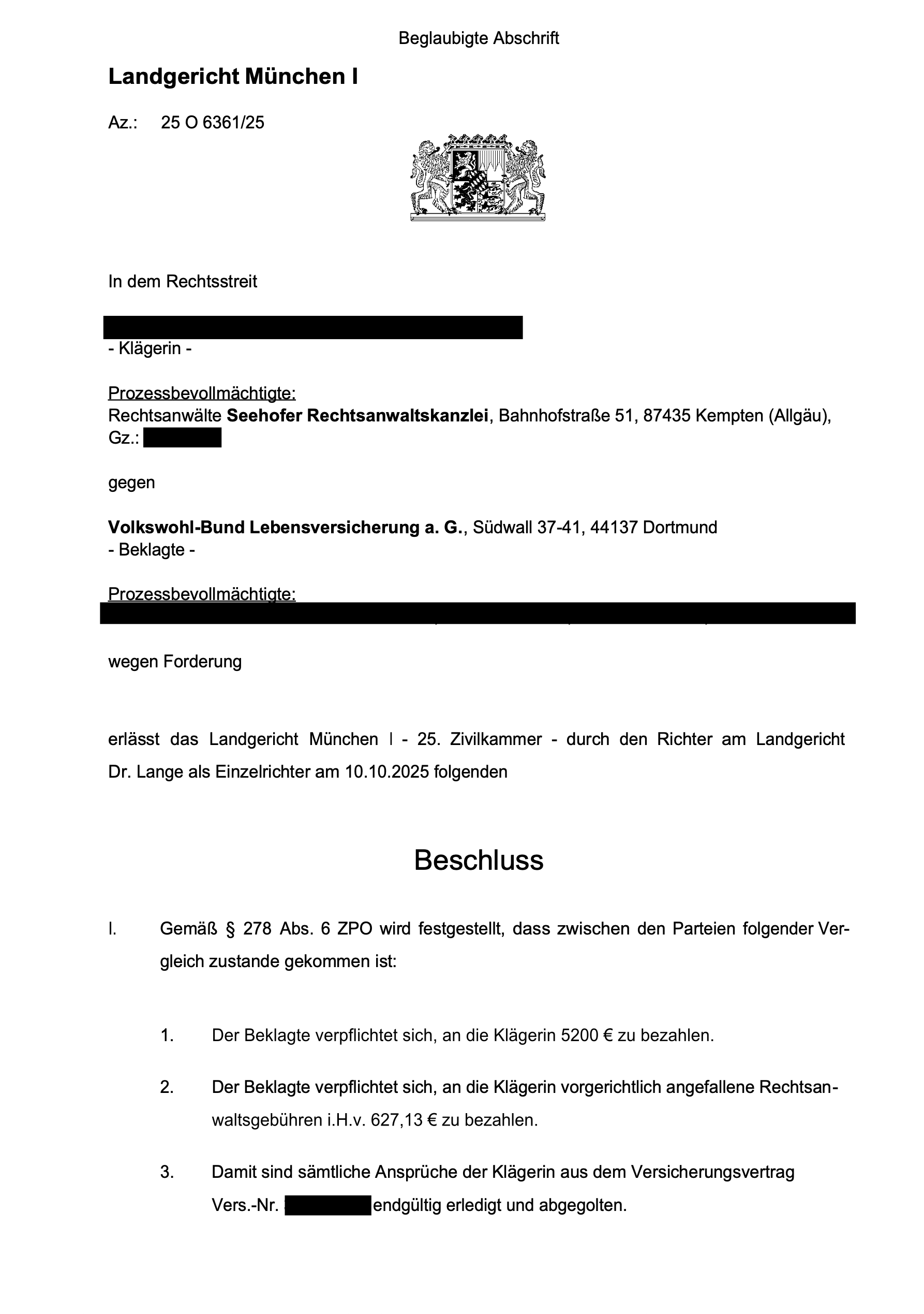 Wir machen die Erfahrung, dass in vielen Fällen gerichtliche Verfahren geführt werden müssen, um dann das gewünschte Ergebnis der Rückabwicklung zu erreichen. Dieser vor dem Landgericht München I geschlossene Vergleich vom Oktober 2025 mit vollständiger Kostenübernahme durch den Volkswohl-Bund zeigt, dass die Versicherungen offensichtlich Urteile scheuen und dann nach entsprechender Einschätzung der Gerichte vielfach bereit sind, einzulenken und die Ansprüche anzuerkennen.