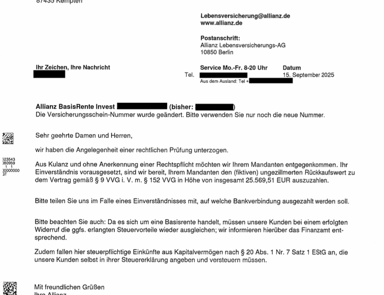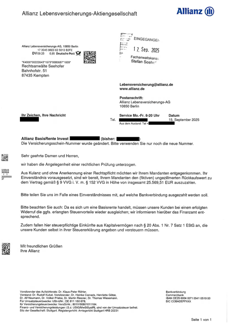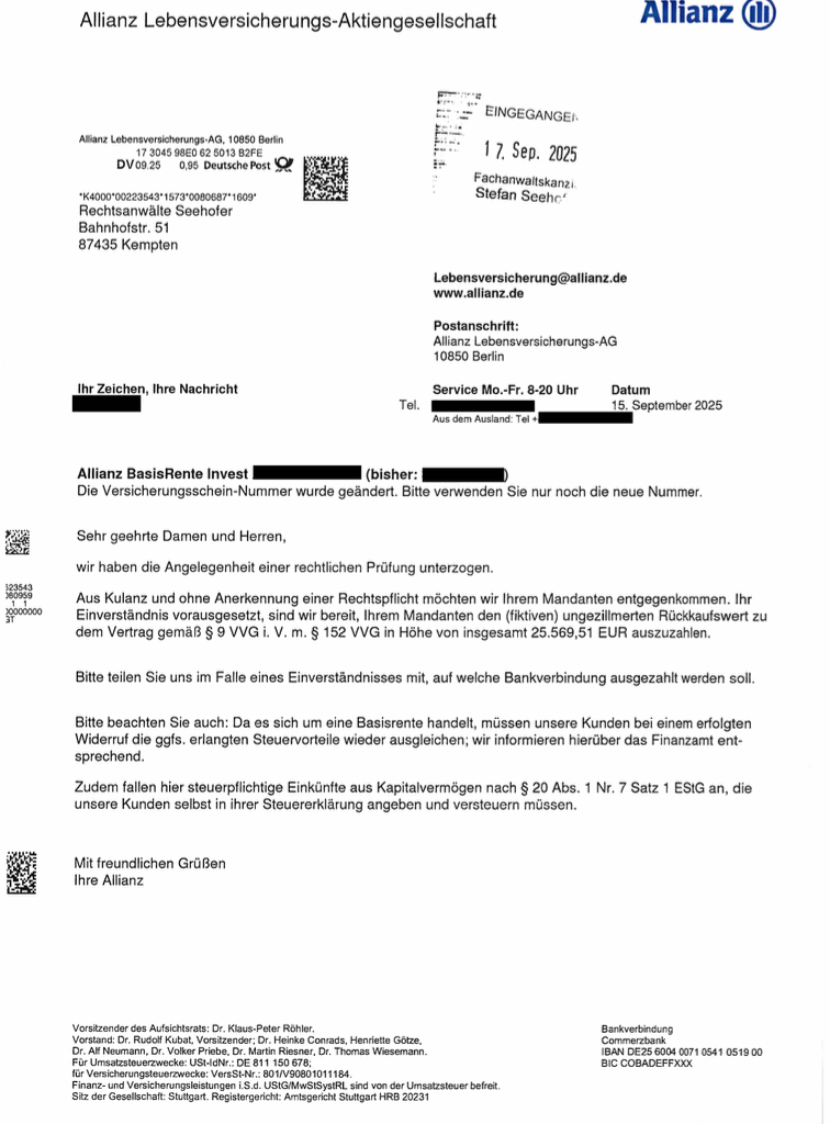 Wieder einmal hat die Fachanwaltskanzlei Seehofer für einen Mandanten die Rückabwicklung eines Basisrentenvertrages bei der Allianz Lebensversicherung erreicht. Es handelte sich um einen Basisrentenvertrag der Allianz mit der Bezeichnung „Allianz BasisRente Invest“, der im Januar 2009 abgeschlossen worden war. Unser Mandant hatte den Vertrag bereits im Sommer 2016 beitragsfrei gestellt und danach keine Einzahlungen mehr geleistet. Nachdem unser Mandant von unserer Kanzlei und der 10-jährigen Erfahrung in diesem Bereich erfahren hatte, wurden wir im August 2025 beauftragt, einen Widerruf wegen fehlerhafter Widerrufsbelehrung durchzusetzen. Der Widerruf wurde mit Schreiben vom 13.8.2025 erklärt; die Allianz antwortete mit Schreiben vom 15.9.2025 und erkannte den Widerruf an, sodass sich unser Mandant nunmehr über einen Auszahlungsbetrag von 25.569,51 € freuen kann, also einen Betrag, der über den einbezahlten Beiträgen liegt.