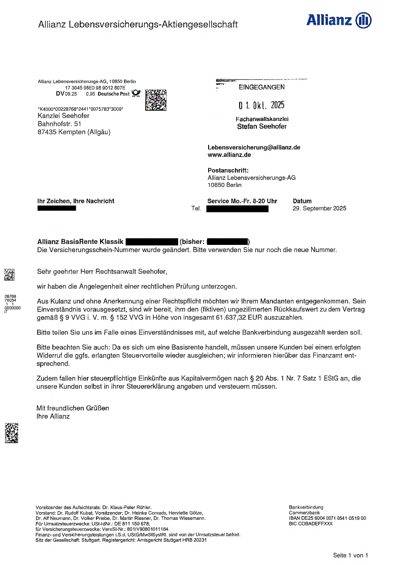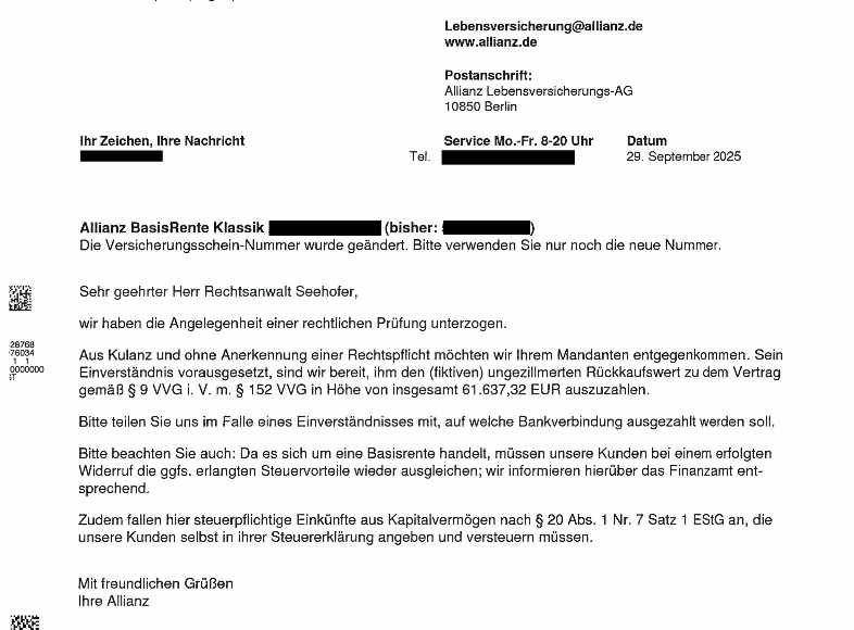 Unserer Kanzlei ist es für einen Mandanten gelungen, einen Allianz Basisrentenvertrag Klassik, der im Jahr 2010 abgeschlossen wurde, rückabzuwickeln. Unser Mandant hatte sich im Sommer 2025 an unsere Kanzlei gewandt und um Überprüfung seines Rürup-Vertrages gebeten. Nach entsprechender Prüfung hat uns unser Mandant mit der Geltendmachung der Ansprüche aus dem Widerruf beauftragt, was dann auch mit Schreiben unserer Kanzlei vom 7. August 2025 erfolgt ist. Nicht einmal 2 Monate später, nämlich mit Schreiben vom 29 September 2025 erkannte die Allianz den erklärten Widerruf an und bot einen Auszahlungsbetrag von 61.637,32 € an, was im Einklang mit den gesetzlichen Vorgaben bei der Rückabwicklung steht. Daher wurde dieses Angebot der Allianz auch akzeptiert, sodass sich unser Mandant nunmehr über diesen erfreulichen Rückzahlungsbetrag freuen kann anstatt über eine im April 2024 von der Allianz bestätigte monatliche Rente ab dem 1. Juni 2036 i.H.v. mitgeteilten 447,40 € (!!).