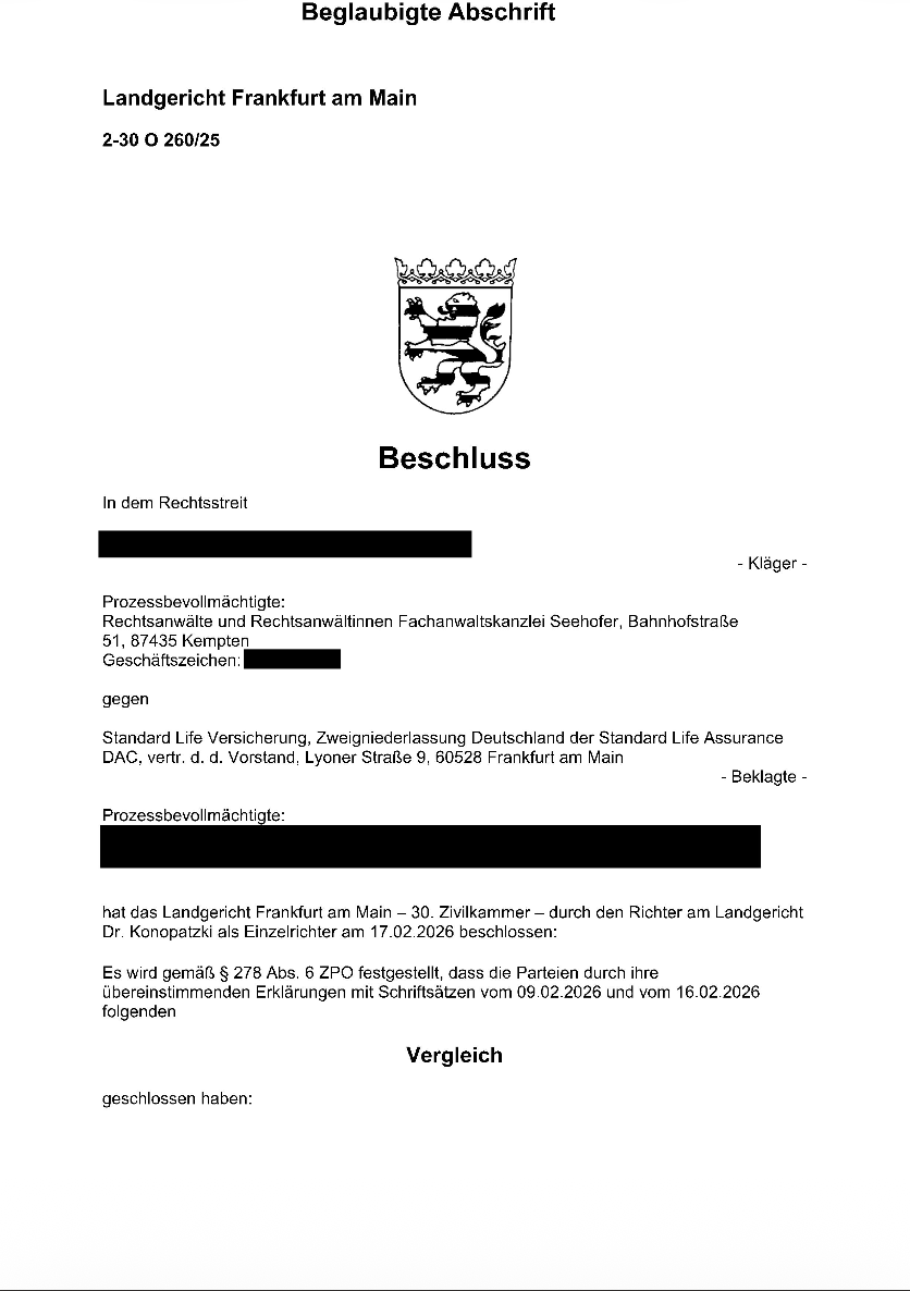 Nach Beratung durch unsere Kanzlei im Jahr 2025 wurde der Widerruf im Mai 2025 wegen einer fehlerhaften Widerrufsbelehrung erklärt. Die Standard Life wies den Widerruf zurück wegen einer angeblich ordnungsgemäß erteilten Belehrung, sodass dann im August 2025 Klage durch unsere Kanzlei zum Landgericht Frankfurt/Main, dem Sitz der Standard Life erhoben wurde.