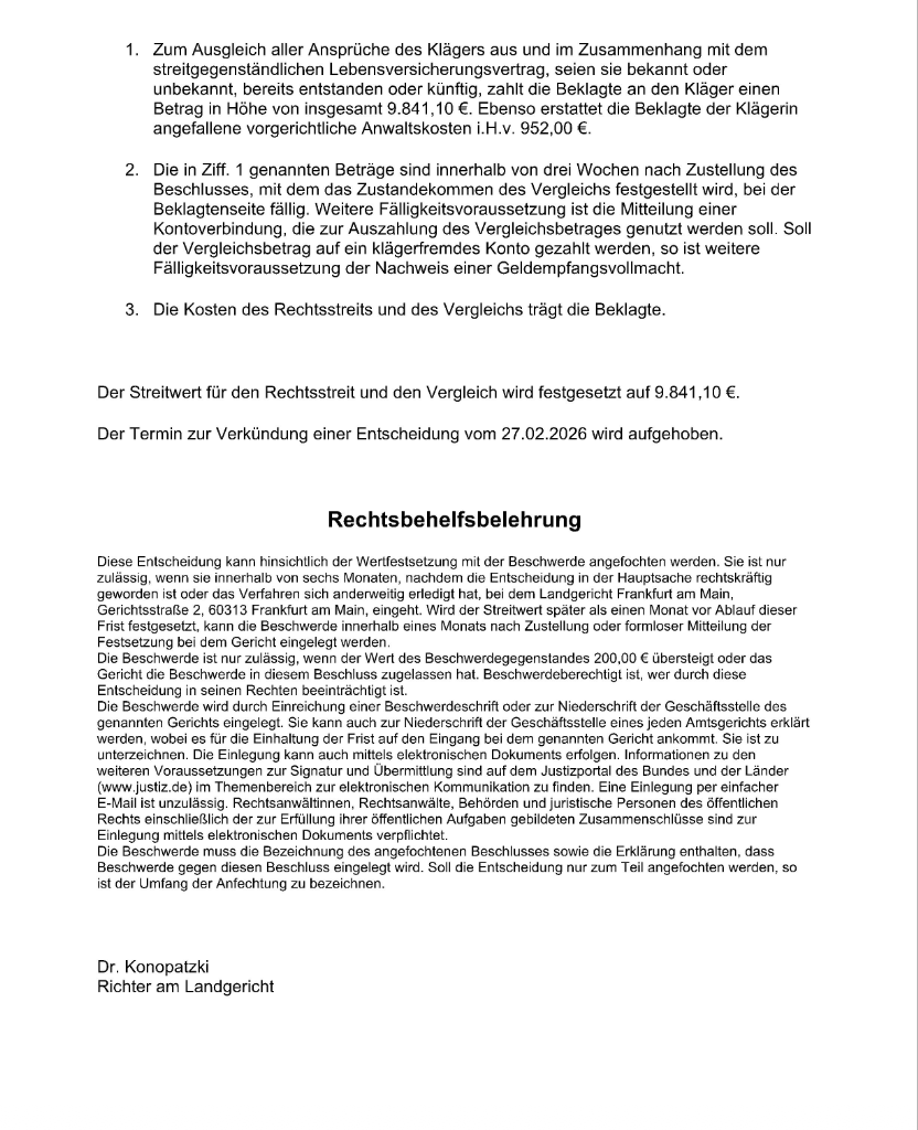 Das Gericht machte in der mündlichen Verhandlung vom 12. Januar 2026 deutlich, dass es der Klage stattgeben würde. Daraufhin zeigte sich die Standard Life vergleichsbereit und verpflichtete sich zur Zahlung des gesetzlich vorgesehenen Rückabwicklungsbetrags von insgesamt 9.841,10 €. Der Rückabwicklungsbetrag setzte sich aus dem Rückkaufswert zum Zeitpunkt des Widerrufs in Höhe von 6.987,52 € sowie den Abschluss- und Verwaltungskosten in Höhe von 2.853,58 € (!!) zusammen.